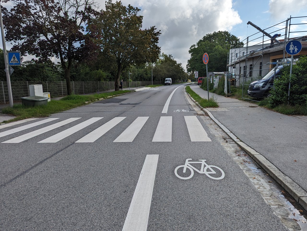 An der Krumbacher Straße zwischen der Asamstraße und Dr.-Filchner-Straße erfolgt auf beiden Straßenseiten die Markierung von Fahrradschutzstreifen. An den Anschlusspunkten der Nebenstraße wird die Radverkehrsfurt rot markiert.
