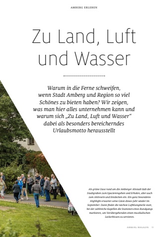 AMBERG MAGAZIN11AMBERG ERLEBENZu Land, Luft und WasserAMBERG MAGAZIN11Warum in die Ferne schweifen, wenn Stadt Amberg und Region so viel Sch%u00f6nes zu bieten haben? Wir zeigen, was man hier alles unternehmen kann und warum sich %u201eZu Land, Luft und Wasser%u201c dabei als besonders bereicherndes Urlaubsmotto herausstelltAls gr%u00fcne Oase rund um die Amberger Altstadt l%u00e4dt der Stadtgraben zum Spazierengehen und Erholen, aber auch zum Aktivsein und Entdecken ein. Ein ganz besonderes Highlight erwartet seine G%u00e4ste dieses Jahr wieder im September: Dann findet die n%u00e4chste Luftklangmeile statt, bei der zahlreiche Kapellen die Stationen eines Rundgangs markieren, um Vor%u00fcbergehenden einen musikalischen Leckerbissen zu servieren.