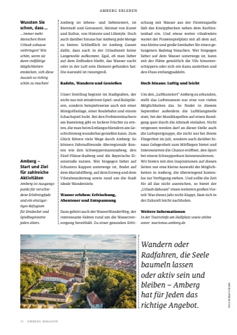 12AMBERG MAGAZINAMBERG ERLEBENAmberg ist lebens- und liebenswert, ist Bierstadt und Genussort, Heimat von Kunst und Kultur, von Historie und Lifestyle. Doch auch dar%u00fcber hinaus hat Amberg jede Menge zu bieten : Schlie%u00dflich ist Amberg Garantdaf%u00fcr, dass auch in der Urlaubszeit keine Langeweile aufkommt. Egal, ob man lieber auf dem Erdboden bleibt, das Wasser sucht oder in der Luft sein Element gefunden hat: Die Auswahl ist riesengro%u00df.Radeln, Wandern und Genie%u00dfenUnser Streifzug beginnt im Stadtgraben, der nicht nur mit attraktiven Spiel- und Bolzpl%u00e4tzen, sondern beispielsweise auch mit einer Minigolfanlage, einer Boulebahn und einem Schachspiel lockt. Bei den Probierstr%u00e4uchern am Basteisteg gibt es leckere Fr%u00fcchte zu ernten, die man beim Entlangschlendern am Geschichtsweg wunderbar genie%u00dfen kann. Zum Gl%u00fcck f%u00fchren viele Wege durch Amberg : So k%u00f6nnen Fahrradfreunde %u00fcberregionale Routen wie den Schweppermannradweg, den F%u00fcnf-Fl%u00fcsse-Radweg und die Bayerische Eisenstra%u00dfe nutzen. Wer hingegen lieber auf Schusters Rappen unterwegs ist, findet auf dem Mariahilfberg, auf dem Erzweg und dem Vilstalwanderweg sowie rund um die Stadt ideale Wanderziele.Wasser erleben: Erfrischung,Abenteuer und EntspannungDazu geh%u00f6rt auch der WasserWanderWeg, der interessante Fakten rund um die Wasserversorgung bereith%u00e4lt. Zu einer gesunden Erfrischung mit Wasser aus der F%u00fcrstenquelle l%u00e4dt das Kneippbecken neben dem Kurf%u00fcrstenbad ein. Und etwas weiter vilsabw%u00e4rts wartet der Piratenspielplatz mit all dem auf, was kleine und gro%u00dfe Seer%u00e4uber f%u00fcr einen gelungenen Badetag brauchen. Wer hingegen lieber auf dem Wasser unterwegs ist, kann mit der Pl%u00e4tte gem%u00fctlich die Vils hinunterschippern oder sich ein Kanu ausleihen und den Fluss entlangpaddeln.Hoch hinaus: Luftig und leichtUm den %u201eLuftkunstort%u201c Amberg zu erkunden, stellt das Luftmuseum nur eine von vielen M%u00f6glichkeiten dar. So findet in diesem September au%u00dferdem die Luftklangmeile statt, bei der Musikkapellen auf einen Rundgang quer durch die Altstadt einladen. Nicht vergessen werden darf an dieser Stelle auch die Luftsportgruppe, die nicht nur bei ihrem Fliegerfest im Juli, sondern auch dar%u00fcber hinaus Gelegenheit zum Mitfliegen bietet und Interessierten die Chance er%u00f6ffnet, den Sport bei einem Schnupperkurs kennenzulernen.Wir bieten mit den Inspirationen auf diesen Seiten nur eine kleine Auswahl der M%u00f6glichkeite n in Amberg, die %u00fcberwiegend kostenlos zur Verf%u00fcgung stehen. Und sollte die Zeit f%u00fcr all das nicht ausreichen, so bietet der %u201eUrlaub dahoam%u201c einen weiteren gro%u00dfen Vorteil: Was dieses Jahr nicht klappt, l%u00e4sst sich in der Zukunft leicht nachholen. Weitere InformationenIn der Touristinfo am Hallplatz sowie online unter: tourismus.amberg.deFoto: Michael GolinskiAmberg %u2013 Start und Ziel f%u00fcr zahlreiche Aktivit%u00e4tenAmberg ist Ausgangspunkt f%u00fcr verschieden e Erlebnispfade und ein einzigartiges Refugium f%u00fcr Entdecker und Spiel begeisterte jeden Alters.Wussten Sie schon, dass%u2026%u2026immer mehr Menschen ihren Urlaub zuhause verbringen? Wie sch%u00f6n, wenn sie dann vielf%u00e4ltige M%u00f6glichkeiten entdecken, sich diese Auszeit so richtig sch%u00f6n zu machen!Wandern oder Radfahren, die Seele baumeln lassen oder aktiv sein und bleiben %u2013 Amberg hat f%u00fcr Jeden das richtige Angebot.