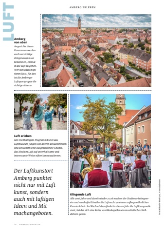 14AMBERG MAGAZINAmberg von obenAngesichts dieses Panoramas werden auch vorsichtige Zeitgenossen Lust bekommen, einmal in die Luft zu gehen. Wer sich dazu inspirieren l%u00e4sst, f%u00fcr den ist die Amberger Luftsportgruppe die richtige Adresse.Luft erleben Mit reichhaltigem Programm bietet das Luftmuseum jungen wie %u00e4lteren Besucherinnen und Besuchern eine ausgezeichnete Chance, das Medium Luft auf unterhaltsame und interessante Weise n%u00e4her kennenzulernen.LUFTKlingende LuftAlle zwei Jahre und damit wieder 2026 machen der Stadtmarketingverein und namhafte K%u00fcnstler die Luftnacht zu einem au%u00dfergew%u00f6hnlichen Kunsterlebnis. Im Wechsel dazu findet in diesem Jahr die Luftklangmeile statt, bei der sich eine Reihe von Blaskapellen ein musikalisches Stelldichein geben.Der Luftkunstort Amberg punktet nicht nur mit Luftkunst, sondern auch mit luftigen Ideen und Mitmachangeboten.AMBERG ERLEBENFoto: Michael Golinski (2x), Marcus Rebmann