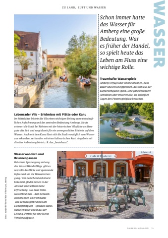 AMBERG MAGAZIN15Wasserwandern und BrunnenpausenBei einem Spaziergang entlang des WasserWanderWegs gibt es reizvolle Ausblicke und spannende Infos rund um die Wasserversorgung. Wer zwischendurch Durst bekommt, findet mitten in der Altstadt eine willkommene Erfrischung: Aus zwei Trinkwasserbrunnen %u2013 dem Schweinchenbrunnen am Viehmarkt und dem B%u00fcrgerbrunnen am Eichenforstplatz %u2013 sprudelt klares, k%u00fchles Wasser direkt aus der Leitung. Perfekt f%u00fcr eine kleine Verschnaufpause.Traumhafte WasserspieleAmberg verf%u00fcgt %u00fcber sch%u00f6ne Brunnen, zwei B%u00e4der und ein Kneippbecken, das sich aus der Kurf%u00fcrstenquelle speist. Eine ganz besondere Attraktion aber erwartet alle, die an hei%u00dfen Tagen den Piratenspielplatz besuchen. WASSERSchon immer hattedas Wasser f%u00fcr Amberg eine gro%u00dfe Bedeutung. War es fr%u00fcher der Handel, so spielt heute das Leben am Fluss eine wichtige Rolle.Lebensader Vils %u2013 Erlebnisse mit Pl%u00e4tte oder KanuIm Mittelalter leistete die Vils einen wichtigen Beitrag zum wirtschaftlichen Aufschwung und der zentralen Bedeutung Ambergs. Heute erinnert die Stadt bei Fahrten mit der historischen Vilspl%u00e4tte an diese gute alte Zeit und sorgt damit f%u00fcr ein unvergessliches Erlebnis auf dem Wasser. Auch mit dem Kanu l%u00e4sst sich die Stadt vorz%u00fcglich vom Wasser aus erkunden, verbunden mit einer kulinarischen Rast . Angebote mit direkter Anbindung bietet z.B. das %u201ebootshaus%u201c.ZU LAND, LUFT UND WASSERFotos: Manfred Wilhelm/B%u00fcro Wilhelm (2x), Moviaq