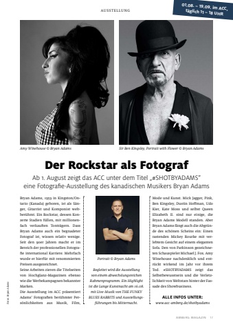 AMBERG MAGAZIN17Bryan Adams, 1959 in Kingston/Ontario (Kanada) geboren, ist als S%u00e4nger, Gitarrist und Komponist weltber%u00fchmt. Ein Rockstar, dessen Konzerte Stadien f%u00fcllen, mit millionenfach verkauften Tontr%u00e4gern. Dass Bryan Adams auch ein begnadeter Fotograf ist, wissen relativ wenige. Seit den 90er Jahren macht er im Bereich der professionellen Fotografie international Karriere. Mehrfach wurde er hierf%u00fcr mit renommierten Preisen ausgezeichnet. Seine Arbeiten zieren die Titelseiten von Hochglanz-Magazinen ebenso wie die Werbekampagnen bekannter Marken. Die Ausstellung im ACC pr%u00e4sentiert Adams %u2018 Fotografien ber%u00fchmter Pers%u00f6nlichkeiten aus Musik, Film, Amy Winehouse %u00a9 Bryan AdamsSir Ben Kingsley, Portrait with Flower %u00a9 Bryan Adams Ab 1. August zeigt das ACC unter dem Titel %u201e#SHOTBYADAMS%u201c eine Fotografie-Ausstellung des kanadischen Musikers Bryan Adams Der Rockstar als Fotograf Mode und Kunst. Mick Jagger, Pink, Ben Kingsley, Dustin Hoffman, Udo Kier, Kate Moss und selbst Queen Elizabeth II . sind nur einige, die Bryan Adams Modell standen. Aber Bryan Adams f%u00e4ngt auch die Abgr%u00fcnde des sch%u00f6nen Scheins ein : Einen rastenden Mickey Rourke mit verlebtem Gesicht auf einem eleganten Sofa. Den von Parkinson gezeichneten Schauspieler Michael J. Fox. Amy Winehouse nachdenklich und entr%u00fcckt wirkend im Jahr vor ihrem Tod. #SHOTBYADAMS zeigt das Selbstbewusstsein und die Verletzlichkeit von Weltstars hinter der Fassade des Showbusiness.ALLE INFOS UNTER:www.acc-amberg.de/shotbyadams01.08. %u2013 19.09. im ACC,t%u00e4glich 11 %u2013 18 UHRAUSSTELLUNGPortrait %u00a9 Bryan Adams Begleitet wird die Ausstellung von einem abwechslungsreichen Rahmenprogramm. Ein Highlight ist die Lange Kunstnacht am 16.08. mit Live-Musik von THE FUNKY BLUES RABBITS und AusstellungsFotos: Bryan Adamsf%u00fchrungen bis Mitternacht.