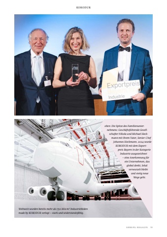 AMBERG MAGAZIN19KORODURoben: Die Spitze des Familienunternehmens: Gesch%u00e4ftsf%u00fchrende Gesellschafter Nikola und Michael Heckmann mit ihrem Vater , Senior-Chef Johannes Heckmann. 2024 wurde KORODUR mit dem Exportpreis Bayern in der Kategorie Industrie ausgezeichnet %u2013 eine Anerkennung f%u00fcr ein Unternehmen, das global denkt, lokal verwurzelt bleibt und stetig neue Wege geht.Weltweit wurden bereits mehr als 750 Mio m%u00b2 Industrieb%u00f6den made by KORODUR verlegt %u2013 stark und widerstandsf%u00e4hig.
