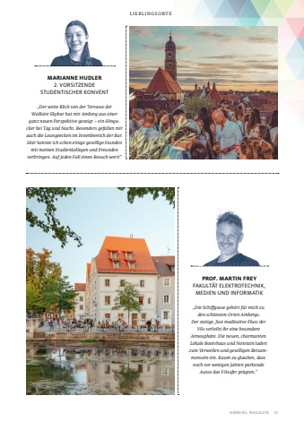 AMBERG MAGAZIN21%u201eDie Schiffgasse geh%u00f6rt f%u00fcr mich zu den sch%u00f6nsten Orten Ambergs. Der stetige, fast meditative Fluss der Vils verleiht ihr eine besondere Atmosph%u00e4re. Die neuen, charmanten Lokale Bootshaus und Notstain laden zum Verweilen und geselligen Beisammensein ein. Kaum zu glauben, dass noch vor wenigen Jahren parkende Autos das Vilsufer pr%u00e4gten.%u201c%u201eDer weite Blick von der Terrasse der Walk%u00fcre Skybar hat mir Amberg aus einer ganz neuen Perspektive gezeigt %u2013 ein Hingucker bei Tag und Nacht. Besonders gefallen mir auch die Loungeecken im Innenbereich der Bar. Hier konnte ich schon einige gesellige Stunden mit meinen Studienkollegen und Freunden verbringen. Auf jeden Fall einen Besuch wert!%u201cPROF. MARTIN FREYFAKULT%u00c4T ELEKTROTECHNIK, MEDIEN UND INFORMATIKMARIANNE HUDLER2. VORSITZENDE STUDENTISCHER KONVENTLIEBLINGSORTE