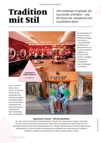 24AMBERG MAGAZINSigi Renner Friseure %u2013 Stil mit GeschichteSeit 1954 wird am Rossmarkt 6 Frisierkunst gelebt. Was einst als %u201eSalon Renner%u201c begann, entwickelte sich unter Sigi und Irmi Renner zum kreativen Haarstudio mit urbanem Flair. Heute f%u00fchren mit Gina und Nadja bereits die T%u00f6chter die Familientradition fort %u2013 mit Stil, Innovation und viel Leidenschaft f%u00fcr Haar und Handwerk. Und wer nach dem Friseurbesuch Lust auf Kaffee oder einen Snack hat, wird gleich nebenan in Ambergs erster italienische r Caff%u00e8-Bar %u201egestatten:Rossi%u201c f%u00fcndig.GESCH%u00c4FTE IM WANDELTradition mit StilDrei Amberger Originale, die Geschichte schreiben %u2013 und bis heute Stil, Handwerk und Gastlichkeit lebenFotos: Sigi Renner FriseurDas Haarstyling von Renner war immer K%u00f6nnen plus Zeitgeist. Auch schon im %u201eSALON RENNER%u201c, den Michael und Margret Renner 1954 im Haus Rossmarkt 6 er%u00f6ffneten. 1970 wurde der Salon renoviert, vergr%u00f6%u00dfert, modernisiert. Die Aufnahme zeigt den damaligen %u201eroten Salon%u201c.Seit 2014 ist Gina Renner, %u00e4lteste Tochter von Sigi und Irmi Renner, f%u00fcr Organisation und Marketing zust%u00e4ndig. Nadja Renner folgte 2016 und ist sei tdem verantwortlich f%u00fcr Kreativmanagement, Ausbildung und interne Fortbildung aller Teammitglieder.HAARSCHNITT,FARBE & MAKE-UPROSSMARKT 6