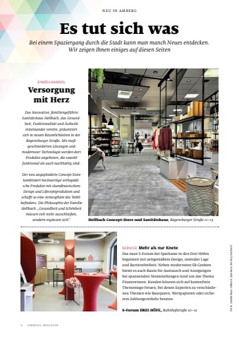 4AMBERG MAGAZINDas innovative, familiengef%u00fchrte Sanit%u00e4tshaus Hellbach, das Gesundheit, Funktionalit%u00e4t und %u00c4sthetik miteinander vereint, pr%u00e4sentiert sich in neuen R%u00e4umlichkeiten in der Regensburger Stra%u00dfe. Mit ma%u00dfgeschneiderten L%u00f6sungen und modernster Technologie werden dort Produkte angeboten, die sowohl funktional als auch nachhaltig sind. Der neu angegliederte Concept Store kombiniert hochwertige orthop%u00e4dische Produkte mit skandinavischem Design und Li festyleprodukten und schafft so eine Atmosph%u00e4re des Wohlbefindens. Die Philosophie der Familie Hellbach: %u201eGesundheit und Sch%u00f6nheit m%u00fcssen sich nicht ausschlie%u00dfen, sondern erg%u00e4nzen sich%u201d.Versorgung mit HerzEINZELHANDELNEU IN AMBERGFotos: Sanit%u00e4tshaus Helbach, Sparkasse Amberg-SulzbachHellbach Concept-Store und Sanit%u00e4tshaus, Regensburger Stra%u00dfe 11 %u201313SERVICE Mehr als nur KneteDas neue S-Forum der Sparkasse in den Drei H%u00f6fen begeistert mit zeitgem%u00e4%u00dfem Design, zentraler Lage und Barrierefreiheit. Neben modernsten SB-Ger%u00e4ten bietet es auch Raum f%u00fcr Austausch und Anregungen bei spannenden Veranstaltungen rund um das Thema Finanzwissen. Kunden k%u00f6nnen sich auf kostenfreie Thementage freuen, bei denen Experten zu verschiedenen Themen wie Bausparen, Wertpapieren oder sicherem Zahlungsverkehr beraten.S-Forum DREI H%u00d6FE, Bahnhofstra%u00dfe 10 %u201312Bei einem Spaziergang durch die Stadt kann man manch Neues entdecken. Wir zeigen Ihnen einiges auf diesen SeitenEs tut sich was