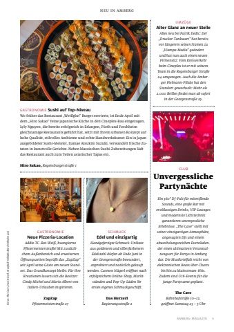 AMBERG MAGAZIN5NEU IN AMBERGEin 360%u00b0 DJ-Pult f%u00fcr mitrei%u00dfende Sounds, eine gro%u00dfe Bar mit erstklassigen Drinks, VIP-Lounges und modernste Lichttechnik garantieren unvergessliche Erlebnisse. %u201eThe Cave%u201c stellt mit seiner einzigartigen Atmosph%u00e4re, angesagten DJs und einem abwechslungsreichen Eventkalender einen ultimativen Veranstaltungsort f%u00fcr Partys in Amberg dar. Die Musikvielfalt reicht von elektronischen Beats %u00fcber Charts bis hin zu Mainstream-Hits. Zudem sind U18-Events f%u00fcr die junge Partyszene geplant.The CaveBahnhofstra%u00dfe 10 %u201312,ge%u00f6ffnet Samstag 23 %u2013 5 UhrUnvergessliche Partyn%u00e4chteNeue Pizzeria-LocationAlter Glanz an neuer Stelle Addio TC-Rot-Wei%u00df, buongiorno Pfistermeisterstra%u00dfe! Mit zus%u00e4tzlichem Au%u00dfenbereich und erweiterten %u00d6ffnungszeiten begr%u00fc%u00dft das %u201eZapZap%u201c seit April seine G%u00e4ste am neuen Standort. Das Grundkonzept bleibt: F%u00fcr ihre Kreationen lassen sich die Besitzer Cindy Michel und Mario Albert von Italien-Urlauben inspirieren. ZapZapPfistermeisterstra%u00dfe 27Alles neu bei Patrik Dedic: Der %u201eDrucker-Tankwart%u201c hat bereits vor l%u00e4ngerem seinen Namen zu %u201eViampa Media%u201c ge%u00e4ndert und hat nun auch einen neuen Firmensitz: Vom Kreisverkehr beim Cineplex ist er mit seinem Team in die Regensburger Stra%u00dfe 24 umgezogen. Auch die Amberger Fielmann-Filiale hat den Standort gewechselt: Mehr als 2.000 Brillen findet man ab sofort in der Georgenstra%u00dfe 19. GASTRONOMIEUMZ%u00dcGEFotos: The Cave, Das Herzerl, Manfred Wilhelm/B%u00fcro Wilhelm (2x)GASTRONOMIE Sushi auf Top-NiveauWo fr%u00fcher das Restaurant %u201eWei%u00dfglut%u201c Burger servierte, ist Ende April mit dem %u201eHiro Sakao%u201c feine japanische K%u00fcche in den Cineplex-Bau eingezogen. Lyly Nguyen, die bereits erfolgreich in Erlangen, F%u00fcrth und Forchheim gleichnamige Restaurants gef%u00fchrt hat, setzt mit ihrem urbanen Konzept auf hohe Qualit%u00e4t, stilvolles Ambiente und echte Handwerkskunst: Ein in Japan ausgebildeter Sushi-Meister, Itamae Atsukito Suzuki, verwandelt frische Zutaten in kunstvolle Gerichte. Neben klassischen Sushi-Zubereitungen l%u00e4dt das Restaurant auch zum Teilen asiatischer Tapas ein. Hiro Sakao,Regensburgerstra%u00dfe 1CLUBSCHMUCK Edel und einzigartig Handgefertigte Schmuck-Unikate aus goldenem und silberfarbenem Edelstahl d%u00fcrfen ab Ende Juni in der Georgenstra%u00dfe bewundert, anprobiert und nat%u00fcrlich gekauft werden. Carmen N%u00e4gerl er%u00f6ffnet nach erfolgreichem Online-Shop, Marktst%u00e4nden und Pop-Up-L%u00e4den ihr erstes eigenes Schmuckgesch%u00e4ft.Das HerzerlRegierungsstra%u00dfe 2