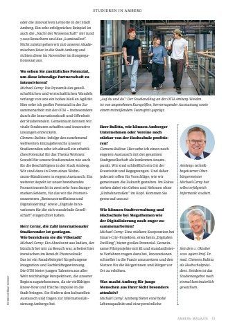 AMBERG MAGAZIN13STUDIEREN IN AMBERGPortr%u00e4ts: Michael Sommeroder die innovativen Lernorte in der Stadt Amberg. Ein sehr erfolgreiches Beispiel ist auch die %u201eNacht der Wissenschaft%u201c mit rund 7.000 Besuchern und das %u201eLuminaFest%u201c. Nicht zuletzt gehen wir mit unserer Akademischen Feier in die Stadt Amberg und richten diese im November im Kongregationssaal aus.Wo sehen Sie zus%u00e4tzliches Potenzial, um diese lebendige Partnerschaft zu intensivieren?Michael Cerny: Die Dynamik des gesellschaftlichen und wirtschaftlichen Wandels verlangt von uns ein hohes Ma%u00df an Agilit%u00e4t. Hier sehe ich gro%u00dfes Potenzial in der Zusammenarbeit mit der OTH %u2013 insbesondere durch die Innovationskraft und Offenheit der Studierenden. Gemeinsam k%u00f6nnen wir vitale Strukturen schaffen und innovative L%u00f6sungen entwickeln. Clemens Bulitta: Infolge des zunehmend weltweiten Einzugsbereichs unserer Studierenden sehe ich aktuell ein erhebliches Potenzial f%u00fcr das Thema Wohnen: Sowohl f%u00fcr unsere Studierenden wie auch f%u00fcr die Besch%u00e4ftigten in der Stadt Amberg. Wir sind dazu in Form eines Wohnraum-B%u00fcndnisses in engem Austausch. Ein weiterer Aspekt ist unser bestehendes Promotionsrecht in zwei sehr forschungsstarken Feldern, f%u00fcr das wir die Promotionszentren %u201eRessourceneffizienz und Digitalisierung%u201c sowie %u201eDigitale Innovationen f%u00fcr die sich wandelnde Gesellschaft%u201c eingerichtet haben. Herr Cerny, die Zahl internationaler Studierender ist gestiegen. Wie bereichern sie die Vilsstadt?Michael Cerny:Ein Absolvent aus Indien, der k%u00fcrzlich bei mir zu Besuch war, arbeitet hier inzwischen im Bereich Photovoltaik: Das ist ein Paradebeispiel f%u00fcr gelungene Integration und Fachkr%u00e4ftegewinnung. Die OTH bietet jungen Talenten aus aller Welt reichhaltige Perspektiven, die unserer Region zugutekommen, da sie vielf%u00e4ltiges Know-how und frische Impulse in die Stadt bringen. Sie f%u00f6rdern den kulturellen Austausch und tragen zur Internationalisierung Ambergs bei. Herr Bulitta, wie k%u00f6nnen Amberger Unternehmen oder Vereine noch st%u00e4rker von der Hochschule profitieren?Clemens Bulitta: Hier sehe ich einen noch engeren Austausch mit der gesamten Stadtgesellschaft als konkreten Ansatzpunkt. Wir sind schlie%u00dflich ein Ort der Kreativit%u00e4t und Begegnungen. Und daher jederzeit offen f%u00fcr Vorschl%u00e4ge, wie wir gemeinsam die Zukunft gestalten. Im Fokus stehen dabei ein Geben und Nehmen ohne %u201eEinbahnstra%u00dfen%u201c im Kopf. Kommen Sie gerne auf uns zu!Wie k%u00f6nnen Stadtverwaltung und Hochschule bei Megathemen wie der Digitalisierung noch enger zusammenarbeiten?Michael Cerny:Eine st%u00e4rkere Kooperation bei Smart-City-Projekten, etwa beim %u201eDigitalen Zwilling%u201c, bietet gro%u00dfes Potenzial. Gemeinsame Pilotprojekte mit KI und standardisierte Verfahren tragen dazu bei, Innovationen schneller in die Praxis umzusetzen und den Nutzen f%u00fcr die B%u00fcrgerinnen und B%u00fcrger vor Ort zu erh%u00f6hen.Was macht Amberg f%u00fcr junge Menschen aus Ihrer Sicht besonders attraktiv?Michael Cerny:Amberg bietet eine hohe Lebensqualit%u00e4t und eine pers%u00f6nliche %u201eAuf du und du%u201c: Der Studienalltag an der OTH Amberg-Weiden ist von angenehmen Kursgr%u00f6%u00dfen, hervorragender Ausstattung sowie einem mitrei%u00dfendem Teamspirit gepr%u00e4gt. Seit dem 1. Oktober 2021 agiert Prof. Dr. med. Clemens Bulitta als Hochschulpr%u00e4sident. Seitdem ist das Studienangebot noch einmal kontinuierlich gewachsen. Ambergs technikbegeisterter Oberb%u00fcrgermeister Michael Cerny hat selbst erfolgreich Informatik studiert.