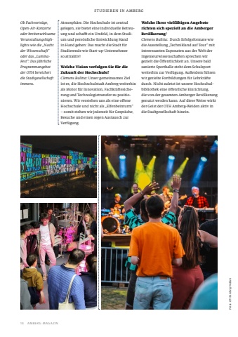 14AMBERG MAGAZINSTUDIEREN IN AMBERGOb Fachvortr%u00e4ge, Open-Air-Konzerte oder breitenwirksame Veranstaltungshighlights wie die %u201eNacht der Wissenschaft%u201c oder das %u201eLuminaFest%u201c: Das j%u00e4hrliche Programmangebot der OTH bereichert die Stadtgesellschaft immens. Atmosph%u00e4re. Die Hochschule ist zentral gelegen, sie bietet eine individuelle Betreuung und schafft ein Umfeld, in dem Studium und pers%u00f6nliche Entwicklung Hand in Hand gehen: Das macht die Stadt f%u00fcr Studierende wie Start-up-Unternehmer so attraktiv!Welche Vision verfolgen Sie f%u00fcr die Zukunft der Hochschule? Clemens Bulitta:Unser gemeinsames Zielist es, die Hochschulstadt Amberg weiterhin als Motor f%u00fcr Innovation, Fachkr%u00e4ftesicherung und Technologietransfer zu positionieren. Wir verstehen uns als eine offene Hochschule und nicht als %u201eElfenbeinturm%u201c %u2013 somit stehen wir jederzeit f%u00fcr Gespr%u00e4che, Besuche und einen regen Austausch zur Verf%u00fcgung.Welche Ihrer vielf%u00e4ltigen Angebote richten sich speziell an die Amberger Bev%u00f6lkerung?Clemens Bulitta: Durch Erfolgsformate wie die Ausstellung %u201eTechnikland auf Tour%u201c mit interessanten Exponaten aus der Welt der Ingenieurwissenschaften sprechen wir gezielt die %u00d6ffentlichkeit an. Unsere bald sanierte Sporthalle steht dem Schulsport weiterhin zur Verf%u00fcgung. Au%u00dferdem f%u00fchren wir gezielte Fortbildungen f%u00fcr Lehrkr%u00e4fte durch. Nicht zuletzt ist unsere Hochschulbibliothek eine %u00f6ffentliche Einrichtung, die von der gesamten Amberger Bev%u00f6lkerung genutzt werden kann. Auf diese Weise wirkt der Geist der OTH Amberg-Weiden aktiv in die Stadtgesellschaft hinein. Fotos: OTH Amberg-Weiden