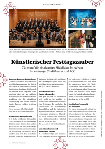 16AMBERG MAGAZINKULTUR IM ADVENTK%u00fcnstlerischer Festtagszauber T%u00fcren auf f%u00fcr einzigartige Highlights im Advent im Amberger Stadttheater und ACCKnusper, knusper, kn%u00e4uschen%u2026%u201eH%u00e4nsel und Gretel%u201c aus der zeitlosen M%u00e4rchensammlung der Gebr%u00fcder Grimm ist eine der bekanntesten Geschichten %u00fcberhaupt. Un%u00fcbertroffen vertont durch Engelbert Humperdinck ging sie als sch%u00f6nste M%u00e4rchenoper der Welt in die Musikgeschichte ein. Die mitrei%u00dfende Inszenierung des Freien Landestheater Bayerns entf%u00fchrt in diesen Kosmos. Am 07.12. um 17 Uhr (Werkeinf%u00fchrung um 16:15 Uhr) im Stadttheater Himmlische Kl%u00e4nge im ACCJ. S. Bachs ber%u00fchmtes Weihnachtsoratorium z%u00e4hlt zu den beliebtesten Werken seines Genres. Der Amberger Oratorienchor und das Amberger Sinfonieorchester unter der musikalischen Leitung von Thomas Appel werden dazu von den Ausnahmesolisten Katharina M%u00fcller (Sopran), ein weltweites Publikum. Erz%u00e4hlt wird die Geschichte von Clara, die in der magischen Nacht des Weihnachtsfestes eine wundersame Reise in ein fantasievolles Universum erlebt. Das Classico Ballet Napoli bietet ein beeindruckendes Tanzerlebnis zu hochemotionaler Musik. Am 18.12. um 19 Uhr im ACC Musikalisch berauschtins neue Jahr F%u00fcr einen schwungvollen Start ins neue Jahr 2026 sorgt traditionell das Silvesterkonzert des Amberger Sinfonieorchesters. Das au%u00dferordentlich unterhaltsame Programm mit Klarinettist Stefan Neger reicht dieses Mal vom Johann-Strau%u00df-Walzer %u201eAn der sch%u00f6nen blauen Donau%u201c bis zu Filmmusik aus %u201eZur%u00fcck in die Zukunft%u201c: %u201ePomp and circumstances%u201c inklusive. Prosit Neujahr! Am 31.12. um 19 Uhr im Stadttheater Ob im festlichen Zusammenspiel von Oratorienchor und Sinfonieorchester, mit der %u201eKnusperhexe%u201c in H%u00e4nsel und Gretel oder beim m%u00e4rchenhaften Tanzreigen des Nussknackers im ACC %u2013 Amberg zeigt im Advent seine ganze B%u00fchnenvielfalt.Fotos: Freies Landestheater Bayern, Dominik Lenz, P.T.F. GmbH-Konzertagentur FriedmannKatharina Heiligtag (Alt) und Johannes Gaubitz (Tenor) und Wiard Witholt (Bass) kongenial unterst%u00fctzt. Am 07.12. um 18 Uhr im ACC Traditionelles undHerzerw%u00e4rmendes Jetzt geht es bald %u201eAf Weihnachtn zou%u201c hei%u00dft es im pr%u00e4chtig geschm%u00fcckten Stadttheater, wenn Florian Gr%u00f6ninger, die 7gscheitn, die Hirtenkinder der Freudenberger Bauernb%u00fchne und die Hahnbacher Alphornbl%u00e4ser das 45. Amberger Adventssingen zelebrieren. Oberpf%u00e4lzer Texte stimmen mit mundartlichen Weihnachtsliedern feierlich auf die %u201estade Zeit%u201c ein.Am 14.12. um 17 Uhr im Stadttheater Von M%u00e4useheeren und lebendigen Puppen P. I. Tschaikowskys %u201eDer Nussknacker%u201c begeistert seit %u00fcber 100 Jahren