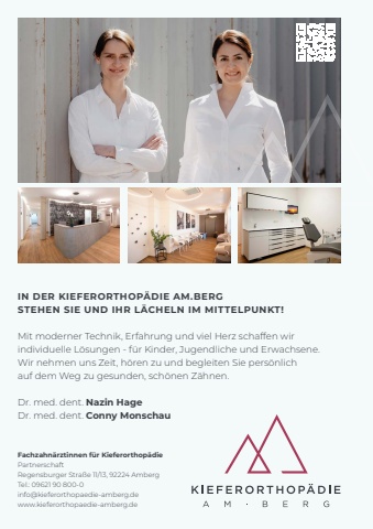 IN DER KIEFERORTHOP%u00c4DIE AM.BERG STEHEN SIE UND IHR L%u00c4CHELN IM MITTELPUNKT!Mit moderner Technik, Erfahrung und viel Herz schaffen wir individuelle L%u00f6sungen - f%u00fcr Kinder, Jugendliche und Erwachsene. Wir nehmen uns Zeit, h%u00f6ren zu und begleiten Sie pers%u00f6nlich auf dem Weg zu gesunden, sch%u00f6nen Z%u00e4hnen.Dr. med. dent. Nazin HageDr. med. dent. Conny MonschauFachzahn%u00e4rztinnen f%u00fcr Kieferorthop%u00e4diePartnerschaftRegensburger Stra%u00dfe 11/13, 92224 AmbergTel.: 09621 90 800-0 info@kieferorthopaedie-amberg.dewww.kieferorthopaedie-amberg.de