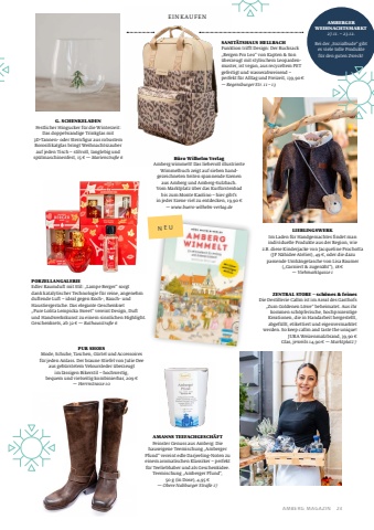 AMBERG MAGAZIN23EINKAUFENG. SCHENKELADENFestlicher Hingucker f%u00fcr die Winterzeit: Das doppelwandige Trinkglas mit 3D-Tannen- oder Sternfigur aus robustem Borosilikatglas bringt Weihnachtszauber auf jeden Tisch %u2013 stilvoll, langlebig und sp%u00fclmaschinenfest, 15 %u20ac %u2014 Marienstra%u00dfe 6PORZELLANGALERIEEdler Raumduft mit Stil: %u201eLampe Berger%u201c sorgt dank katalytischer Technologie f%u00fcr reine, angenehm duftende Luft %u2013 ideal gegen Koch-, Rauch- und Haustierger%u00fcche. Das elegante Geschenkset%u201ePure Lolita Lempicka Sweet%u201c vereint Design, Duftund Handwerkskunst zu einem sinnlichen Highlight.Geschenksets, ab 32 %u20ac %u2014 Rathausstra%u00dfe 6AMANNS TEEFACHGESCH%u00c4FTFeinster Genuss aus Amberg: Die hauseigene Teemischung %u201eAmberger Pfund%u201c vereint edle Darjeeling-Noten zu einem aromatischen Klassiker %u2013 perfekt f%u00fcr Teeliebhaber und als Geschenkidee.Teemischung %u201eAmberger Pfund%u201c, 50 g (in Dose), 4,95 %u20ac%u2014 Obere Nabburger Stra%u00dfe 17ZENTRAL STORE %u2013 sch%u00f6nes & feinesDie Destillerie Callm ist im Areal des Gasthofs %u201eZum Goldenen L%u00f6we%u201c beheimatet. Aus ihr kommen sch%u00f6pferische, hochprozentige Kreationen, die in Handarbeit hergestellt, abgef%u00fcllt, etikettiert und eigenvermarktet werden. So keep callm and taste the unique! JURA Weizenmalzbrand, 39,90 %u20ac Glas, jeweils 14,90 %u20ac %u2014 Marktplatz 7PUR SHOESMode, Schuhe, Taschen, G%u00fcrtel und Accessoires f%u00fcr jeden Anlass. Der braune Stiefel von Julie Dee aus geb%u00fcrstetem Veloursleder %u00fcberzeugt im l%u00e4ssigen Bikerstil %u2013 hochwertig, bequem und vielseitig kombinierbar, 209 %u20ac%u2014 Herrnstrasse 10SANIT%u00c4TSHAUS HELLBACHFunktion trifft Design: Der Rucksack %u201eBergen Pro Leo%u201c von Kapten & Son %u00fcberzeugt mit stylischem Leopardenmuster, ist vegan, aus recyceltem PET gefertigt und wasserabweisend %u2013 perfekt f%u00fcr Alltag und Freizeit, 139,90 %u20ac%u2014 Regensburger Str. 1113LIEBLINGSWERKIm Laden f%u00fcr Handgemachtes findet man individuelle Produkte aus der Region, wie z.B. diese Kinderjacke von Jacqueline Prochotta (JP N%u00e4hidee Atelier), 49 %u20ac, oder die dazu passende Umh%u00e4ngetasche von Lisa Baumer (%u201eGarniert & zugen%u00e4ht%u201c), 18 %u20ac%u2014 Viehmarktgasse 1B%u00fcro Wilhelm VerlagAmberg wimmelt! Das liebevoll illustrierte Wimmelbuch zeigt auf sieben handgezeichneten Seiten spannende Szenen aus Amberg und Amberg-Sulzbach. Vom Marktplatz %u00fcber das Kurf%u00fcrstenbad bis zum Monte Kaolino %u2013 hier gibt%u2019s in jeder Szene viel zu entdecken, 19,90 %u20ac%u2014 www.buero-wilhelm-verlag.deN E UAMBERGER WEIHNACHTSMARKT27.11. %u2013 23.12. Bei der %u201eSozialbude%u201c gibt es viele tolle Produkte f%u00fcr den guten Zweck!