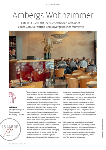 26AMBERG MAGAZINGASTRONOMIEAmbergs Wohnzimmer Caf%u00e9 Kult %u2013 ein Ort, der Generationen verbindet. Voller Genuss, W%u00e4rme und unvergesslicher MomenteSeit 25 Jahren ist das Caf%u00e9 Kult in Amberg weit mehr als nur ein Ort zum Essen und Trinken %u2013 es ist ein St%u00fcck Stadtleben. Schon beim Betreten f%u00e4llt die moderne Architektur mit der gro%u00dfen Glasfront ins Auge: lichtdurchflutet, offen, aber zugleich angenehm gem%u00fctlich. Wer hier Platz nimmt, sp%u00fcrt sofort, warum das Kult f%u00fcr viele l%u00e4ngst zum zweiten Wohnzimmer geworden ist.Hier treffen sich Generationen: Stammg%u00e4ste, die seit der ersten Stunde dabei sind, Paare beim ersten Date, Familien zum Fr%u00fchst%u00fcck oder zu festlichen Anl%u00e4ssen %u2013 von Taufen bis Hochzeiten. Selbst in schweren Momenten wie nach einer Beerdigung finden Menschen im Kult Raum f%u00fcr Begegnung und Trost. Es ist ein Lokal, das das Leben in all seinen Facetten begleitet.Kulinarisch bietet das Caf%u00e9 Kult ein breites Spektrum: vom ausgedehnten Fr%u00fchst%u00fcck %u2013 besonders beliebt das %u201eKult Deluxe%u201c f%u00fcr zwei Personen %u2013 bis hin zu internationalen und mediterranen Gerichten. Suppen, Salate, Pasta, Steaks und asiatische K%u00f6stlichkeiten wechseln sich ab. Viele schw%u00e4rmen vom Wokgericht %u201eBangkok%u201c %u2013 einem Gefl%u00fcgelragout in Thai-Currysauce mit Mandelreis %u2013 und dem %u201eZwiebelrostbraten%u201c vom rosa gebratenen Roastbeef auf Kr%u00e4uterjus mit Pommes.Mittags erfreut sich der Business Lunchgro%u00dfer Beliebtheit; am Nachmittag locken Kaffeespezialit%u00e4ten, Bio-Tees sowie hausgemachte Kuchen. Die K%u00fcche bleibt dabei durchg%u00e4ngig warm %u2013 ein seltener Komfort. Und in der Adventszeit sorgt das %u201eG%u00e4nsetaxi%u201c f%u00fcr festliche Stimmung.Caf%u00e9 KultEmailfabrikstra%u00dfe 12%u00d6ffnungszeiten: Mo bis So 9 %u2013 23 UhrFoto: Manfred Wilhelm/B%u00fcro Wilhelm