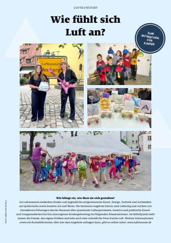 AMBERG MAGAZIN27Wie klingt sie, wie l%u00e4sst sie sich gestalten? Im Luftmuseum entdecken Kinder und Jugendliche zeitgen%u00f6ssische Kunst, Design, Technik und Architektur auf spielerische sowie kreative Art und Weise. Die betreuten Angebote hierzu sind vielseitig und reichen von interaktiven F%u00fchrungen durchs Museum %u00fcber spannende Luftexperimente, kreative und praktische Einzelund Gruppenarbeiten bis hin zum eigenen Kindergeburtstag im Fliegenden Klassenzimmer. Im Mittelpunkt steht immer die Freude, das eigene Erleben und teils auch eine ordentliche Prise frische Luft. Weitere Informationen sowie ein Kontaktformular, %u00fcber das man Angebote anfragen kann, gibt es online unter: www.luftmuseum.deWie f%u00fchlt sich Luft an?Fotos: Luftmuseum AmbergLUFTKUNSTORTZUM MITMACHENF%u00dcR KINDER