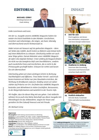 AMBERG MAGAZIN1Liebe Leserinnen und Leser, mit der 19. Ausgabe unseres AMBERG Magazins halten Sie wieder ein St%u00fcck Stadtliebe in den H%u00e4nden: Geschichten, Gesichter und Geheimtipps, die zeigen, wie bunt, lebendig und %u00fcberraschend unsere Heimatstadt ist.Dabei setzen wir bewusst auf ein gedrucktes Magazin %u2013 denn wir lieben das Gef%u00fchl, durch Seiten zu bl%u00e4ttern und einmal nicht auf einen Bildschirm zu schauen. Gleichzeitig wollen wir auch neue Wege gehen. Darum bekommt unser AMBERG Magazin ab sofort eine digitale Heimat: Unter amberg.de/magazin finden Sie nicht nur das komplette Heft zum Durchbl%u00e4ttern, sondern auch zus%u00e4tzliche Fotos und Geschichten, die es nicht in die Printausgabe geschafft haben. Schauen Sie vorbei und lassen Sie sich %u00fcberraschen!Gleichzeitig gehen wir einen wichtigen Schritt in Richtung Nachhaltigkeit und Effizienz. Trotz hoher Verteil- und Druckkosten konnten wir bisher nur jene Haushalte erreichen, die Werbung im Briefkasten zulassen. K%u00fcnftig setzen wir daher st%u00e4rker auf Pr%u00e4senz vor Ort: Sie finden das AMBERG Magazin kostenlos zum Mitnehmen in vielen Gesch%u00e4ften, Restaurants, in der B%u00fcrgerinformation und nat%u00fcrlich in der Tourist-Info.Wir hoffen, dass Sie diesen Weg mit uns gehen. Und vielleicht nehmen Sie ja auch eine kleine Botschaft aus dieser Ausgabe mit: Hinterfragen Sie das Altbew%u00e4hrte, wagen Sie Neues und gestalten Sie Ihre Zukunft bewusst und mit Freude.Ihr Michael CernyEDITORIALMICHAEL CERNYOberb%u00fcrgermeister der Stadt AmbergINHALT6Zeit f%u00fcr sichF%u00fcnf Angebote, mit denen man abschalten, entspannen und neue Energie tanken kann10Studieren in AmbergInterview %u00fcber Forschung, Innovation und Partnerschaft zwischen Stadt und OTH24Festlich einkaufenStilvolle Mode, funkelnde Deko und tolle GeschenkideenFotos: Michael Sommer, Petra Kellner, OTH Amberg-Weiden, Stefan Hahn/B%u00fcro WilhelmUnter amberg.de/magazin sind alle Ausgaben des Magazins zum Durchbl%u00e4ttern online verf%u00fcgbar. Die beliebte Rubrik %u201eAmbergs sch%u00f6nste Seiten%u201c, spannende Titelgeschichten und Insidertipps %u2013 alles nur noch einen Klick entfernt. DIGITALE AUSGABEImpressumHerausgeber: Stadt Amberg, Kommunikation & MarketingMarktplatz 11, 92224 Amberg / Tel. 09621-101810 / magazin@amberg.deRedaktion: Simon Hauck, Simone Plail, Sibylle Sandner, Thomas Graml, Ina Bogner, Michael Golinski, Philipp Koch, Manfred WilhelmKoordination: Simone Plail, Philipp KochGestaltung: Philipp Koch / B%u00fcro Wilhelm, Amberg Auflage: 54.700 Exemplare | Das AMBERG Magazin erscheint 2x im JahrDruck: Das AMBERG Magazin wird auf PEFC-zertifiziertem Papier (Umschlag) und auf Recyclingpapier aus 100% Altpapier (Inhalt) gedruckt.klima-druckde %u00b7 ID-Nr23154586