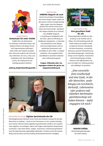 AMBERG MAGAZIN29AUS DEM RATHAUSB%u00dcRGERBETEILIGUNGDigitale Sprechstunde des OBOberb%u00fcrgermeister Michael Cerny sucht den direkten Austausch mit den Menschen in Amberg %u2013 nicht nur bei Terminen vor Ort, sondern k%u00fcnftig auch online. Mit der neuen digitalen Sprechstunde schafft er ein zus%u00e4tzliches Angebot, um Anliegen, Ideen und Fragen unkompliziert besprechen zu k%u00f6nnen. Unter dem Motto %u201eFragen. Antworten. Gemeinsam gestalten!%u201c wird die Sprechstunde regelm%u00e4%u00dfig stattfinden. Termine sowie die Anmeldung sind ab sofort auf www.amberg.de/buergermeisteramt verf%u00fcgbar.VERTEILUNG AMBERG Magazin ab 2026Durch eine geringere Druckauflage und somit weniger Papier wollen wir Ressourcen schonen und gleichzeitig daf%u00fcr sorgen, dass das Magazin gezielter bei unseren treuen Leserinnen und Lesern landet. Auf diesen drei Wegen erhalten Sie in Zukunft das AMBERG Magazin:1.) Zustellung im Stadtgebiet %u00fcber die OWZ, sofern Sie Werbung im Briefkasten akzeptieren. 2.) Kostenlos zum Mitnehmen in der B%u00fcrgerund Touristinformation sowie in zahlreichen Restaurants und Gesch%u00e4ften in Ihrer N%u00e4he. 3.) Digital entdecken: Alle Ausgaben online durchbl%u00e4ttern und mehr entdecken unter amberg.de/magazin.Fragen, W%u00fcnsche oder Anregungen richten Sie gerne an:magazin@amberg.deVielfalt lebt vom Mitmachen! Im Amberger Arbeitskreis Kultur und Religion k%u00f6nnen sich B%u00fcrger*innen und Organisationen einbringen,Ideen teilen und Projekte ansto%u00dfen. Hier wird unter anderem der Diversity Day vorbereitet, der am 19. Mai 2026 stattfinden wird. Eine Einladung an alle, die Amberg bunt und lebendig gestalten m%u00f6chten.amberg.de/gleichstellungsstelle%u201eEine vorurteilsfreie Gesellschaft und eine Stadt, in der alle Menschen, unabh%u00e4ngig von Geschlecht, Herkunft, Lebensweise oder anderen individuellen Merkmalen gleichberechtigt teilhaben k%u00f6nnen %u2013 daf%u00fcr engagiere ich mich.%u201cNADINE GR%u00c4MLGleichstellungsbeauftragte der Stadt AmbergARBEITSKREIS Gemeinsam f%u00fcr mehr VielfaltGLEICHSTELLUNGEine gerechtere Stadt f%u00fcr alleChancengleichheit betrifft uns alle %u2013 im Beruf, in der Familie und im Alltag. Die Gleichstellungsstelle der Stadt Amberg mit Nadine Gr%u00e4ml ist daf%u00fcr die zentrale Anlaufstelle. Sie bietet kostenlose, vertrauliche Beratung, etwa bei Diskriminierung oder Benachteiligungen. Gleichzeitig bringt sie mit Projekten, Netzwerken und Veranstaltungen wichtige Themen in die %u00d6ffentlichkeit und setzt sich daf%u00fcr ein, Amberg gerechter und vielf%u00e4ltiger zu gestalten.Fotos: Adobe Stock, Thomas Graml, Michael Golinski