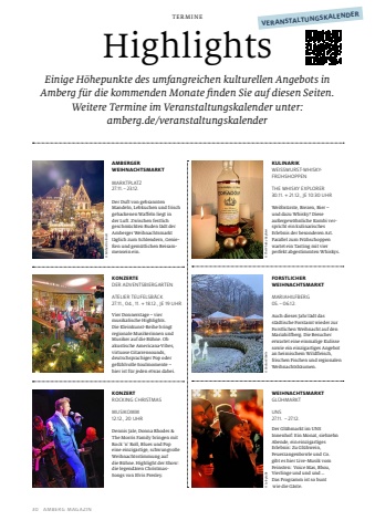30AMBERG MAGAZINAMBERGER WEIHNACHTSMARKTMARKTPLATZ27.11.23.12.Der Duft von gebrannten Mandeln, Lebkuchen und frisch gebackenen Waffeln liegt in der Luft. Zwischen festlich geschm%u00fcckten Buden l%u00e4dt der Amberger Weihnachtsmarkt t%u00e4glich zum Schlendern, Genie%u00dfen und gem%u00fctlichen Beisammensein ein.KONZERTEDER ADVENTSBIERGARTENATELIER TEUFELSB%u00c4CK27.11., 04., 11. + 18.12., JE 19 UHRVier Donnerstage %u2013 vier musikalische Highlights. Die Kleinkunst-Reihe bringt regionale Musikerinnen und Musiker auf die B%u00fchne. Ob akustische Americana-Vibes, virtuose Gitarrensounds, deutschsprachiger Pop oder gef%u00fchlvolle Soulmomente %u2013 hier ist f%u00fcr jeden etwas dabei.KONZERTROCKING CHRISTMASMUSIKOMM12.12., 20 UHRDennis Jale, Donna Rhodes & The Morris Family bringen mit Rock %u2019n%u2019 Roll, Blues und Pop eine einzigartige, schwungvolle Weihnachtsstimmung auf die B%u00fchne. Highlight der Sho die legend%u00e4ren ChristmasSongs von Elvis Presley. KULINARIKWEISSWURST-WHISKYFR%u00dcHSHOPPENTHE WHISKY EXPLORER30.11. + 21.12., JE 10:30 UHRWei%u00dfw%u00fcrste, Brezen, Bier %u2013 und dazu Whisky? Diese au%u00dfergew%u00f6hnliche Kombi verspricht ein kulinarisches Erlebnis der besonderen Art. Parallel zum Fr%u00fchschoppen wartet ein Tasting mit vier perfekt abgestimmten Whiskys.FORSTLICHER WEIHNACHTSMARKTMARIAHILFBERG05.%u201306.12.Auch dieses Jahr l%u00e4dt das st%u00e4dtische Forstamt wieder zur Forstlichen Weihnacht auf den Mariahilfberg. Die Besucher erwartet eine einmalige Kulisse sowie ein einzigartiges Angebot an heimischem Wildfleisch, frischen Fischen und regionalen Weihnachtsb%u00e4umen.WEIHNACHTSMARKTGL%u00dcHMARKT UNS27.11. 27.12.Der Gl%u00fchmarkt im UNS Innenhof: Ein Monat, siebzehn Abende, ein einzigartiges Erlebnis: Zu Gl%u00fchwein, Feuerzangenbowle und Co. gibt es hier Live-Musik vom Feinsten: Voice Mas, Bbou, Vierlinge und und und%u2026 Das Programm ist so bunt wie die G%u00e4ste.TERMINE%u00a9 Michael Golinski%u00a9 The Whisky Explorer%u00a9 Paulus Eiberle%u00a9 LolografieHighlightsEinige H%u00f6hepunkte des umfangreichen kulturellen Angebots in Amberg f%u00fcr die kommenden Monate finden Sie auf diesen Seiten. Weitere Termine im Veranstaltungskalender unter: amberg.de/veranstaltungskalenderVERANSTALTUNGSKALENDER