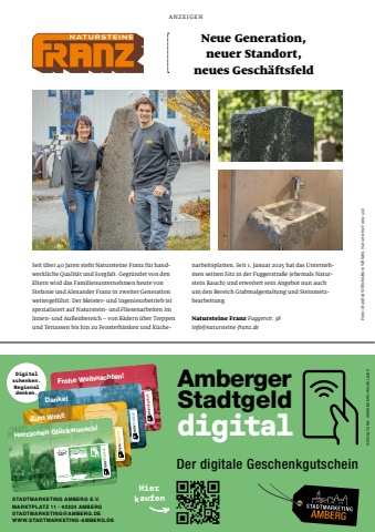 32AMBERG MAGAZINSeit %u00fcber 40 Jaren steht Natursteine Franz f%u00fcr handwerkliche Qualit%u00e4t und Sorgfalt. Gegr%u00fcndet von den Eltern wird das Familienunternehmen heute von Stefanie und Alexander Franz in zweiter Generation weitergef%u00fchrt. Der Meister- und Ingenieurbetrieb ist spezialisiert auf Naturstein- und Fliesenarbeiten im Innen- und Au%u00dfenbereich %u2013 von B%u00e4dern %u00fcber Treppen und Terrassen bis hin zu Fensterb%u00e4nken und K%u00fcchenarbeitsplatten. Seit 1. Januar 2025 hat das Unternehmen seinen Sitz in der Fuggerstra%u00dfe (ehemals Naturstein Rauch) und erweitert sein Angebot nun auch um den Bereich Grabmalgestaltung und Steinmetzbearbeitung.Natursteine FranzFuggerstr. 38info@natursteine-franz.deNeue Generation, neuer Standort, neues Gesch%u00e4ftsfeldANZEIGENDer digitale GeschenkgutscheindigitalAmbergerStadtgeldSTADTMARKETING AMBERG E.V.MARKTPLATZ 11 %u2022 92224 AMBERGSTADTMARKETING@AMBERG.DEWWW.STADTMARKETING-AMBERG.DEDigital schenken.Regional denken.GESTALTUNG: WWW.BUERO-WILHELM.DESTADTMARKETINGAMBERG Amberger WeihnachtsmarktDer digitaleGeschenkgutscheindigitalAmbergerStadtgeldFroheWeihnachten!AmbergerStadtgeldFrohe Weihnachten!STADTMARKETINGAMBERGMi%u000c elalterliche StadtmauerDer digitaleGeschenkgutscheindigitalAmbergerStadtgeldAmbergerStadtgeldDanke!Danke!GeschenkgutscheinSTADTMARKETINGAMBERGAmbergerStadtgeldDer digitaleGeschenkgutscheinSTADTMARKETINGAMBERG%u0004 erstadt AmbergDer digitaleGeschenkgutscheindigitalAmbergerStadtgeldZum Wohl!AmbergerStadtgeldZum Wohl!STADTMARKETINGAMBERG Landesgartenschaugel%u00e4ndeDer digitaleGeschenkgutscheindigitalAmbergerStadtgelddigitalAmbergerStadtgeldHerzlichenGl%u00fcckwunsch!Herzlichen Gl%u00fcckwunsch!Hier kaufenFotos: Manfred Wilhelm/B%u00fcro Wilhelm, Natursteine Franz (2x)