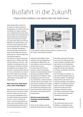 6AMBERG MAGAZINBusfahrt in die ZukunftCitybus feiert Jubil%u00e4um und w%u00e4chst %u00fcber die Stadt hinausJeden Morgen gibt es einen Ort in Amberg, an dem das Leben in Bewegung ist: Ein Sch%u00fcler reibt sich verschlafen die Augen, w%u00e4hrend seine Lieblingsmusik aus den Kopfh%u00f6rern klingt. Eine Gesch%u00e4ftsfrau im Hosenanzug und mit Aktentasche checkt noch einmal ihre E-Mails, ein junger Vater f%u00fcttert sein kleines M%u00e4dchen mit Apfelscheiben, und eine %u00e4ltere Dame tr%u00e4gt ihren Korb f%u00fcr den Markteinkauf. Wir befinden uns am Amberger Busbahnhof %u2013 dem pulsierenden Herzst%u00fcck der Stadt, an dem Wege sich kreuzen, Menschen ein- und aussteigen und Geschichten beginnen.Seit mehr als 30 Jahren, genauer gesagt seit dem 2. Oktober 1995, f%u00e4hrt hier der Citybus ein und aus %u2013 halbst%u00fcndlich, zuverl%u00e4ssig und f%u00fcr alle Generationen. Die Busse verbinden den Bahnhof mit wichtigen Orten der Stadt: vom Gymnasium %u00fcber das ACC bis zum Klinikum. F%u00fcr viele ist der Citybus mehr als ein Verkehrsmittel, er ist Teil des Alltags, ein Ort voller kleiner Erinnerungen und Begegnungen.Blick nach vorne: Mehr Reichweite, mehr NachhaltigkeitNeben dem R%u00fcckblick lohnt sich ein Blick nach vorne: Schritt f%u00fcr Schritt wird der Citybus sein Netz erweitern und auch umliegende Orte an das Stadtverkehrssystem anbinden. Ab dem 1. Januar 2026 f%u00e4hrt die Linie 411 bis nach Ammerthal, die Linie 403 bis nach K%u00f6fering. In den kommenden Jahren sollen weitere Orte wie Karmens%u00f6lden, FreudenFotos: Michael Golinskiberg oder Etsdorf folgen. Damit erhalten noch mehr B%u00fcrgerinnen und B%u00fcrger die M%u00f6glichkeit, das Auto stehen zu lassen und bequem mit dem Bus zu reisen.Doch die Stadt will nicht nur wachsen, sondern auch gr%u00fcner werden. Ein entscheidender Schritt: Ab Januar 2026 f%u00e4hrt die H%u00e4lfte der Busflotte rein elektrisch. Diese Umstellung senkt nicht nur die CO%u2082-Emissionen, sondern reduziert auch den L%u00e4rm in den Stra%u00dfen. Und auch optisch ver%u00e4ndert sich einiges: Aus den bekannten gelben Citybussen werden neue Fahrzeuge in den bayerischen Farben Wei%u00df und Blau, die modern und einladend durch Amberg rollen.Mit dem neuen Expressbus Neumarkt und die Oberpfalz erkundenNicht nur der Citybus, auch der regionale Verkehr f%u00e4hrt neue Wege. Besonders spannend ist die neue Linie 460E, die Amberg und Neumarkt verbindet. Montag bis Samstag verkehrt sie im Stundentakt, sonntags alle zwei Stunden. Unterwegs h%u00e4lt der Bus unter anderem in Pilsach, Lauterhofen, Kastl und Ursensollen.Die Linie eignet sich perfekt, um die reizvolle Oberpf%u00e4lzer Natur zu erkunden: Wander- und Radwege liegen direkt an der Strecke, ein spontaner Ausflug ist also jederzeit m%u00f6glich. F%u00fcr Inspiration, Routentipps und weitere Ausflugsideen lohnt sich ein Blick auf www.amberger-sulzbacher-land.de %u2013 hier finden Interessierte Anregungen, um ihre Freizeit aktiv und nachhaltig zu gestalten.Blick nach vornDer Citybus feiert nicht nur ein Jubil%u00e4um, er verdeutlicht auch, wie sich die Mobilit%u00e4t in unserer ST%u00c4DTISCHER NAHVERKEHRIn den Amberger Stadtnachrichten wurde vor 30 Jahren der Start des Citybus-Linienverkehrs verk%u00fcndet.
