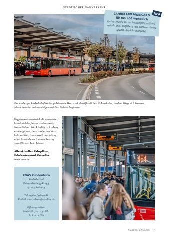 AMBERG MAGAZIN7ST%u00c4DTISCHER NAHVERKEHRDer Amberger Busbahnhof ist das pulsierende Herzstuck des %u00f6ffentlichen Nahverkehrs, an dem Wege sich kreuzen, Menschen ein- und aussteigen und Geschichten beginnen.Region weiterentwickelt: vernetzter, komfortabler, leiser und umweltfreundlicher. Wer k%u00fcnftig in Amberg einsteigt, nutzt ein modernes Verkehrsmittel, das sowohl den Alltag erleichtert als auch einen Beitrag zum Klimaschutz leistet.Alle aktuellen Fahrpl%u00e4ne,Fahrkarten und Aktuelles: www.znas.deJAHRESABO MOBICARD f%u00fcr nur 26%u20ac monatlichUnbegrenzte Fahrten im kompletten Stadtverkehr inkl. Tra%u00dflberg und K%u00fcmmersbruck (g%u00fcltig ab 9 Uhr morgens)ZNAS Kundenb%u00fcroBusbahnhofKaiser-Ludwig-Ring 592224 AmbergTel. 09621 / 9607668E-Mail:%u00a0znaszobam@t-online.de%u00d6ffnungszeiten:Mo bis Fr 7 %u2013 17:30 UhrSa 8 %u2013 12 UhrTIPP